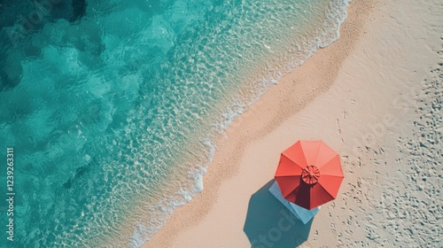 Naklejka premium Vibrant Red Umbrella on Sandy Beach with Clear Blue Water
