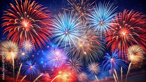 Naklejka premium Vibrant red, white, and blue fireworks erupt against a dark canvas, their...