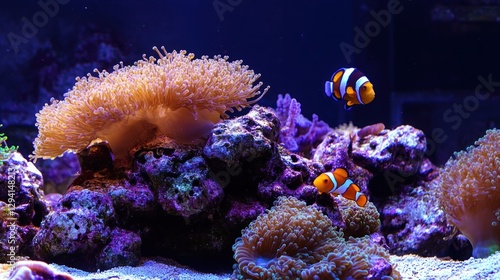 © Fikri, Fototapeta premium Vibrant Reef Aquarium: Two Clownfish Gracefully Swim Amongst Lush Coral and Rocks