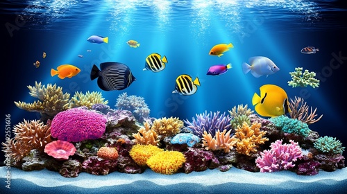 Naklejka premium Vibrant reef fish swim, coral backdrop, underwater scene