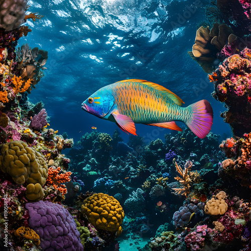 Fototapeta premium Vibrant reef fish swimming amidst colorful coral. A breathtaking underwater...