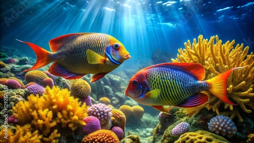 © sunton, Fototapeta premium Vibrant Reef Inhabitants Gracefully Swimming Amidst a Lush Coral Garden Underneath Sunlit Ocean Waters