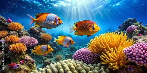 Naklejka premium Vibrant Reef Scene Featuring Colorful Fish and Coral Formations in a Sunlit...