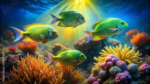 Naklejka premium Vibrant Reef Scene Featuring Four Tropical Fish Swimming Amidst Colorful...