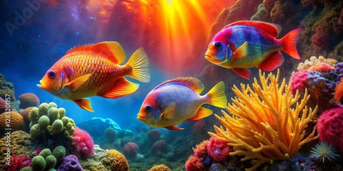 Fototapeta premium Vibrant Reef Scene Featuring Three Colorful Fish Swimming Amongst Lush Coral...