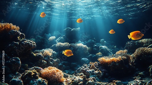 Naklejka premium Vibrant Reef Scene With Yellow Fish And Coral