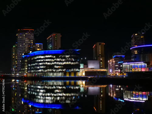 © Oddpal, Fototapeta premium Vibrant reflections of modern buildings in Salford, Greater Manchester on calm dark water at night, copy space.