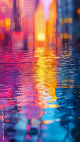 Naklejka premium Vibrant reflections on water surface during urban evening lights with colorful hues and textures