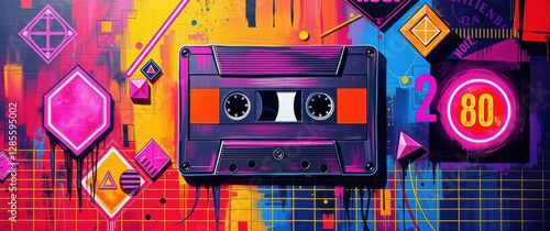 Fototapeta premium Vibrant retro artwork featuring a cassette tape and neon geometric shapes,...