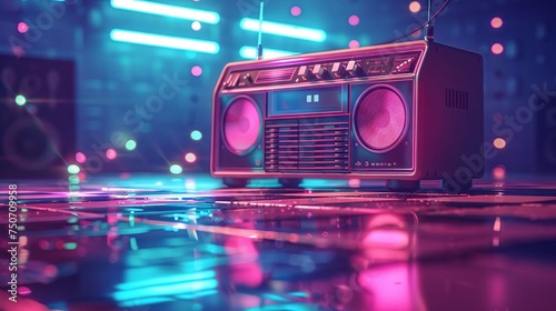 Fototapeta premium Vibrant retro party scene with a neon pink boombox on a dazzling dance floor