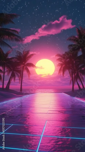 Naklejka premium Vibrant retro 80s smartphone wallpaper featuring neon grid, palm trees, and a...