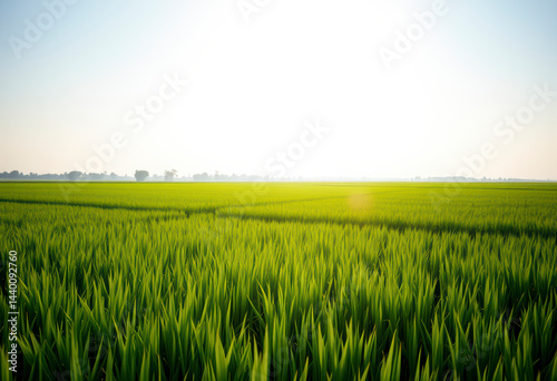 © Aleksander, Obraz premium Vibrant rice paddy field stretches across the landscape, showcasing neat green rows under a clear blue sky with bright sunlight.