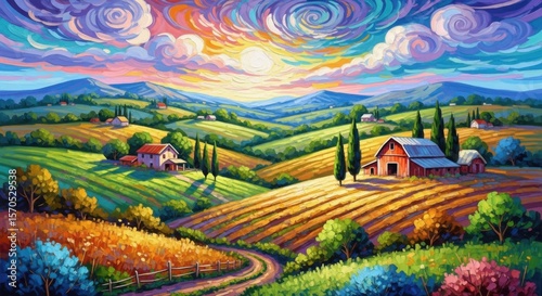© Sai, Fototapeta premium Vibrant Rolling Hills Countryside Landscape Painting at Sunset