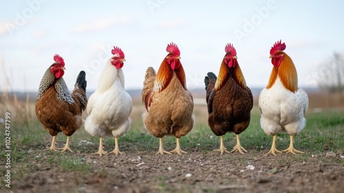 © Business Image, Fototapeta premium Vibrant rooster gathering in a spring countryside setting for farm decor