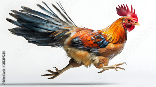Fototapeta premium Vibrant Rooster Running with Dynamic Feathers on a White Background