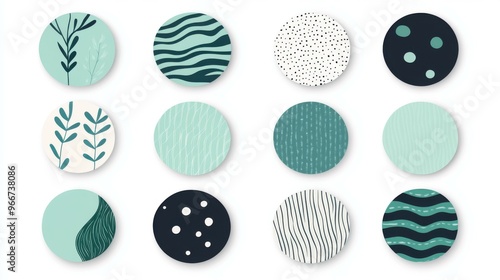 Fototapeta premium Vibrant round badges with mint, green, and blue hues, showcasing modern cartoonstyle textures for a fresh look.