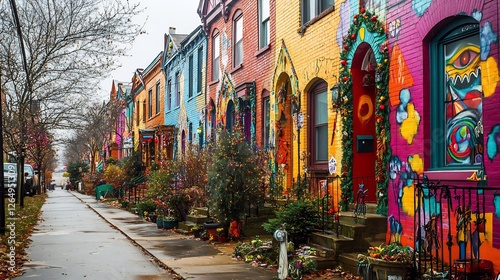 © themondunee, Fototapeta premium Vibrant Row Houses: A Colorful Street Scene in Autumn