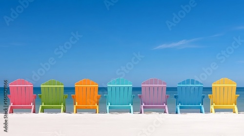 Naklejka premium Vibrant Row of Colorful Beach Chairs on a Pristine Sandy Beach