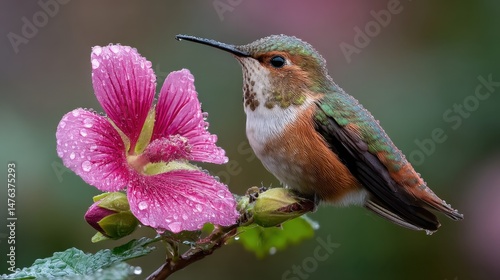 © Soba, Fototapeta premium Vibrant rufous hummingbird with pink flower and dewdrops