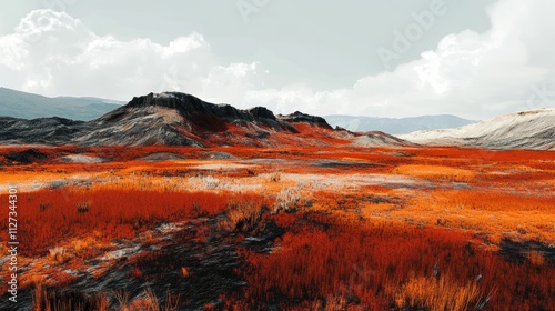 © NFTNexus, Fototapeta premium Vibrant rusty landscape of a former mining site showcasing red polluted sands and an arid atmosphere against a dramatic sky