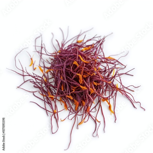 © Content & Code, Naklejka premium Vibrant Saffron Threads Isolated on a Clean White Background Showcasing Delicate Texture and Structure