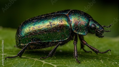Fototapeta premium Vibrant scarab beetle with iridescent green purple and gold shell on a leaf
