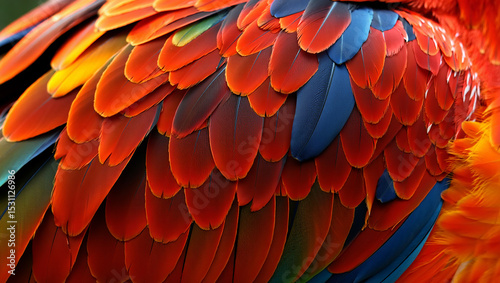 © Taohidul, Fototapeta premium Vibrant Scarlet Macaw Feathers Close-Up: A Detailed Look at Nature's Colorful Palette