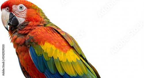 Obraz premium Vibrant Scarlet Macaw feathers shine brightly against pure white background....