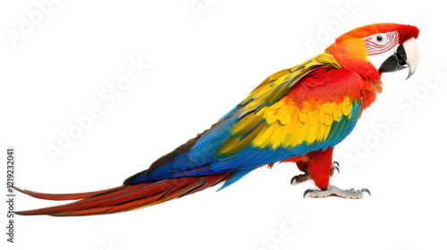 © Perkoro, Fototapeta premium Vibrant Scarlet Macaw Parrot Displaying Brilliant Colors and Unique Plumage, Showcasing Bright Red, Yellow, Green, and Blue Feathers Against a Clean Background
