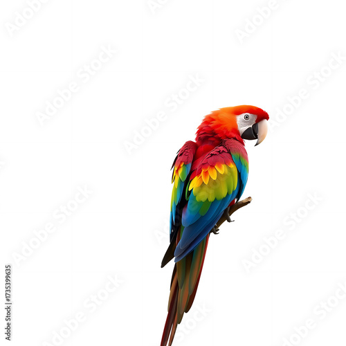 © Jony, Naklejka premium Vibrant scarlet macaw parrot perched on a branch against a white background