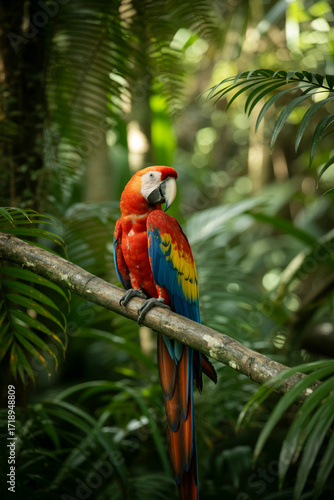 Obraz premium Vibrant scarlet macaw parrot perched on a branch in a lush tropical rainforest environment