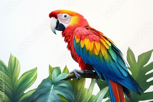 © kriengsak, Fototapeta premium Vibrant Scarlet Macaw Parrot Perched on Branch Amid Lush Tropical Foliage