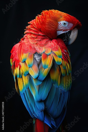 © AIPhoto, Obraz premium Vibrant Scarlet Macaw Parrot with Colorful Feathers on Black Background