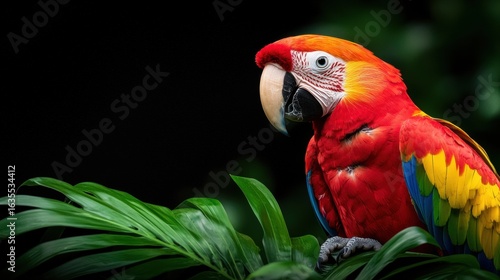 Fototapeta premium Vibrant scarlet macaw perched among lush green leaves
