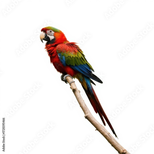 © pimpat, Fototapeta premium Vibrant Scarlet Macaw Perched Gracefully on a Branch Against White Background