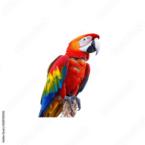 © Thuntaree, Naklejka premium Vibrant Scarlet Macaw Perched on a Branch with Colorful Feathers