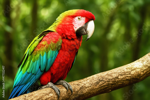 © Kepler, Fototapeta premium Vibrant scarlet macaw perched on branch in lush green jungle setting