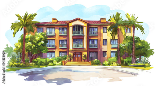 Fototapeta premium vibrant school building surrounded by palm trees and greenery