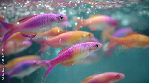 Fototapeta premium Vibrant school of fish in an aquarium, showcasing a variety of pink and...