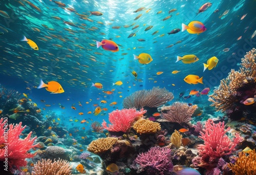 Fototapeta premium vibrant school tropical fish swimming amidst multicolored coral reef ecosystem under crystal clear water, underwater, colorful, marine, sea, ocean