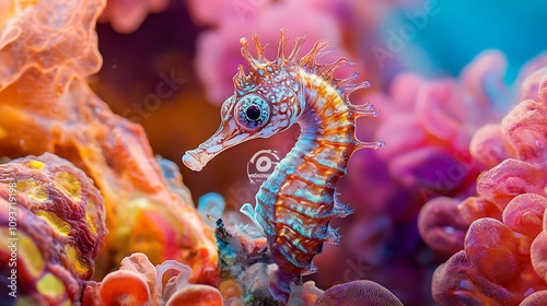 Naklejka premium Vibrant seahorse in a coral reef. This tiny creature's intricate details and...