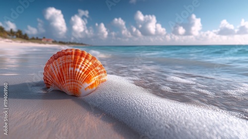 © Studio Stock Noerul, Obraz premium Vibrant Seashell on Sandy Shore at Sunrise with Gentle Ocean Waves.