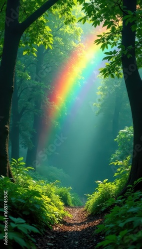 © Pasika, Obraz premium Vibrant secondary rainbow arc over lush green canopy, beauty, vibrant colors