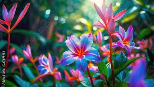 © Rizvan, Fototapeta premium Vibrant Senggani Flower in Tropical Setting Surrounded by Lush Greenery and Soft Sunlight Creating a Serene Natural Atmosphere
