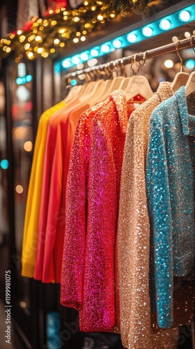 Obraz premium Vibrant Sequin Blouses Hanging in Boutique with Festive Holiday Lighting