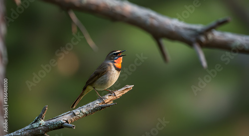 Obraz premium Vibrant Siberian Rubythroat Serenading Amidst the Verdant Taiga Backdrop