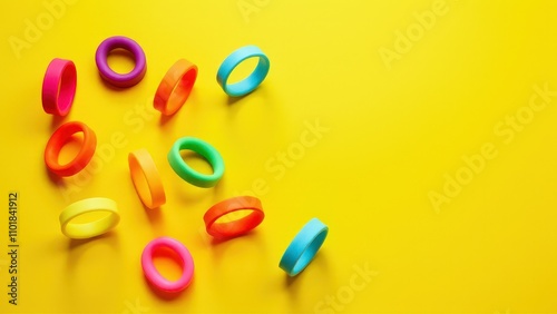 © ArtPro, Naklejka premium Vibrant silicone bracelets scattered on a bright yellow background.
