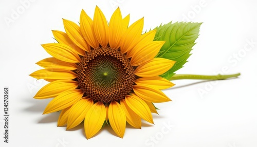 © Aryazu, Fototapeta premium Vibrant Single Sunflower with Leaf on White Background