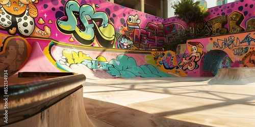 © Brian, Fototapeta premium vibrant skate park with graffiti covered cement and obstacles - empty with no people