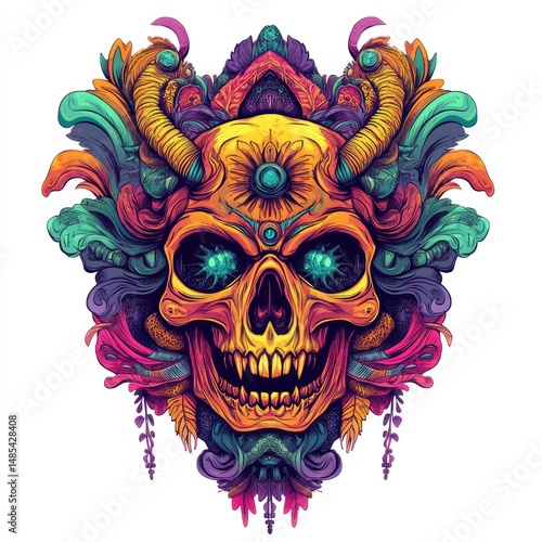 Fototapeta premium Vibrant skull design surrounded by ornate floral and decorative elements.
